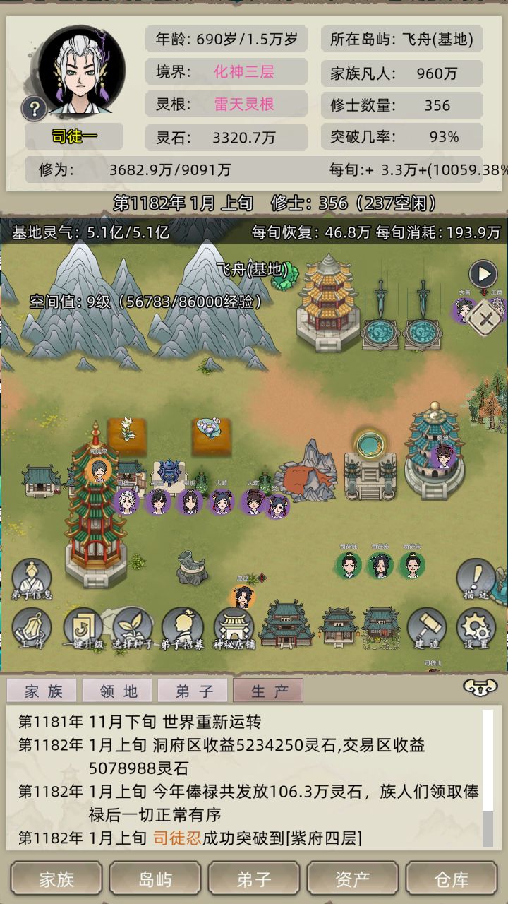 四、家族发展:1.洞府区和交易区逐渐升至满级赚钱,其余建筑和宝物也逐渐升级,小绿瓶种植福佑草九龙草,或者在拍卖会购买福佑丹,为生娃做好准备。