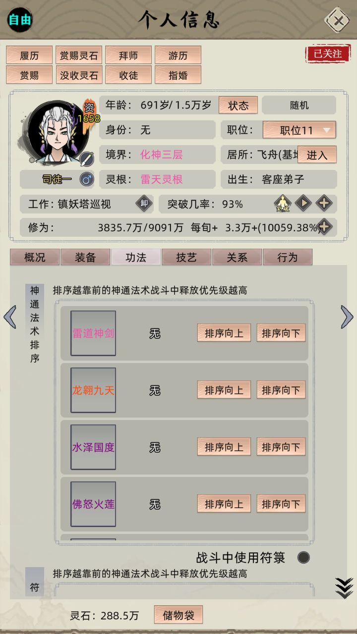 5.功法如图,可以适当调整,风灵根换开天剑典,需要刷一些比较好的自创,推荐玄章玉箓自创后通过商铺收购刷属性,道经大圆满加法伤无用,6层即可,遗忘真魔和道经的神通,保证输出技能在首位。
