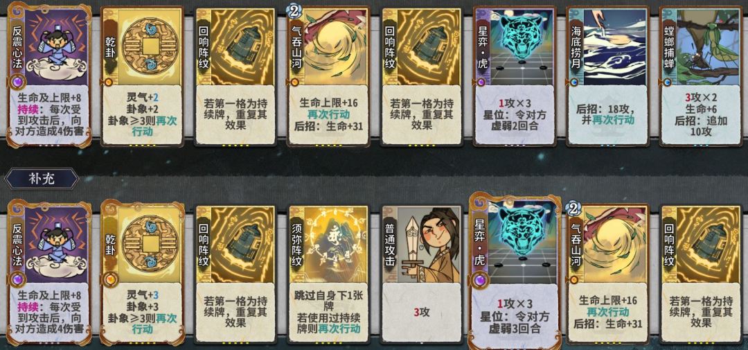 此时以逸待劳为超模状态,轻d找到3张耗蓝卡,后面跟一些卦伤卡和无消耗卡,可以达到最大效率。筑基期为强势期