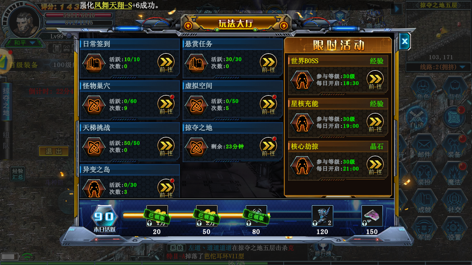 - 基因裂变:100级开启,1-5人组队,击杀病毒母体掉落金色武器、幻石宝箱,基因积分助力成长;