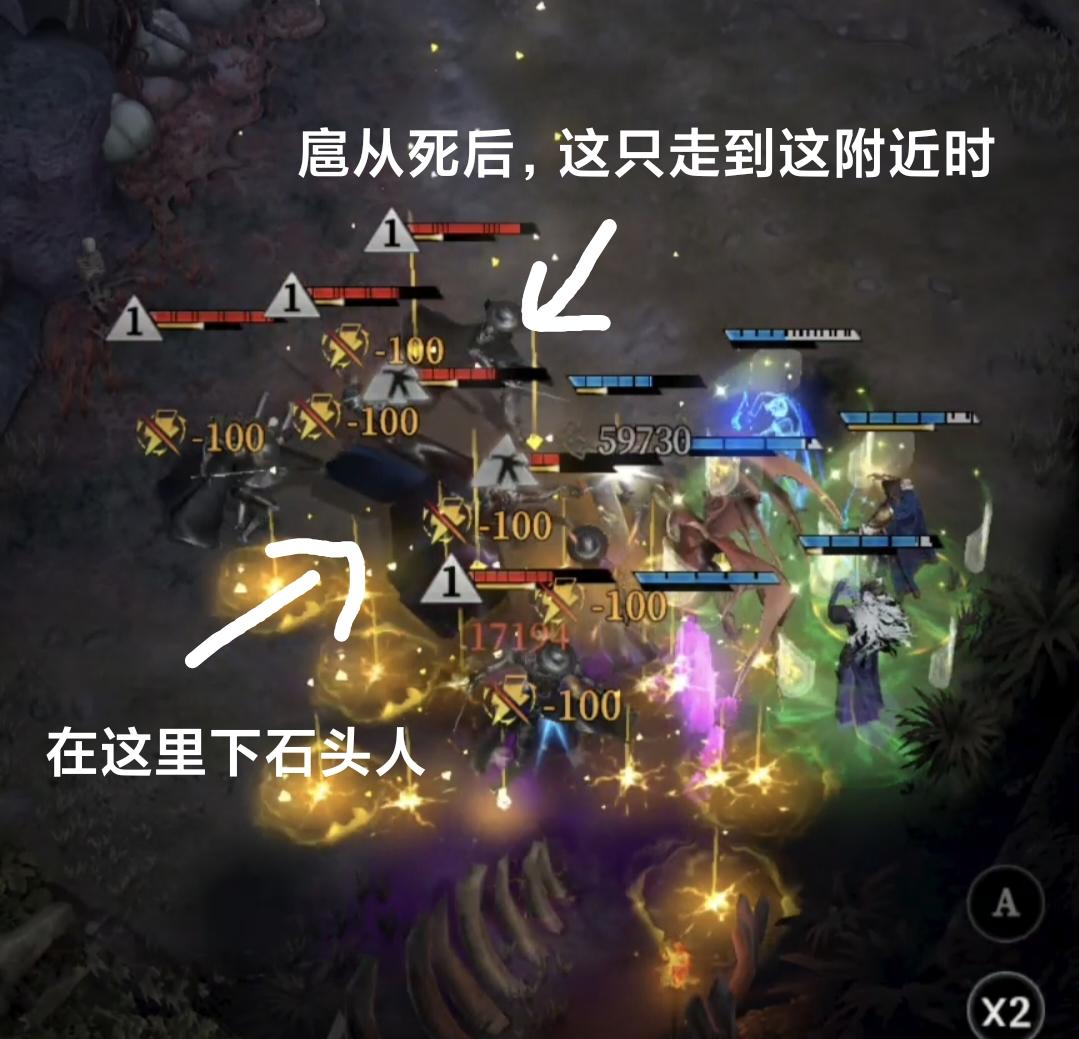 补充一些细节说明:矮子、鹿头、扈从、石头人死亡后生成的墓碑要刚好能在骨语左边接连续上,这样骨语就不会受到攻击。