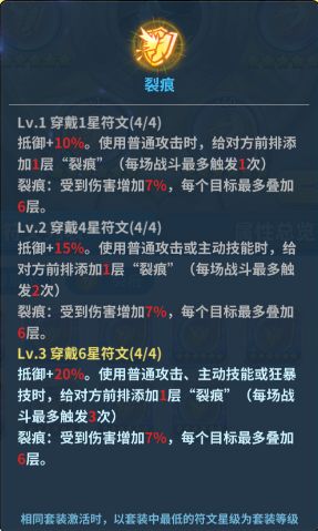 6星:抵御+20%。使用普通攻击、主动技能或狂暴技时,给对方前排添加1层“裂痕”(每场战斗最多触发3次)裂痕:受到伤害增加7%,每个目标最多叠加6层。