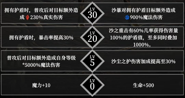 敌人阵亡时,泽菲拉会将其转化为砂砾,使自身获得护盾,至多转化3次。生命值首次低于50%时,泽菲拉也会获得护盾。