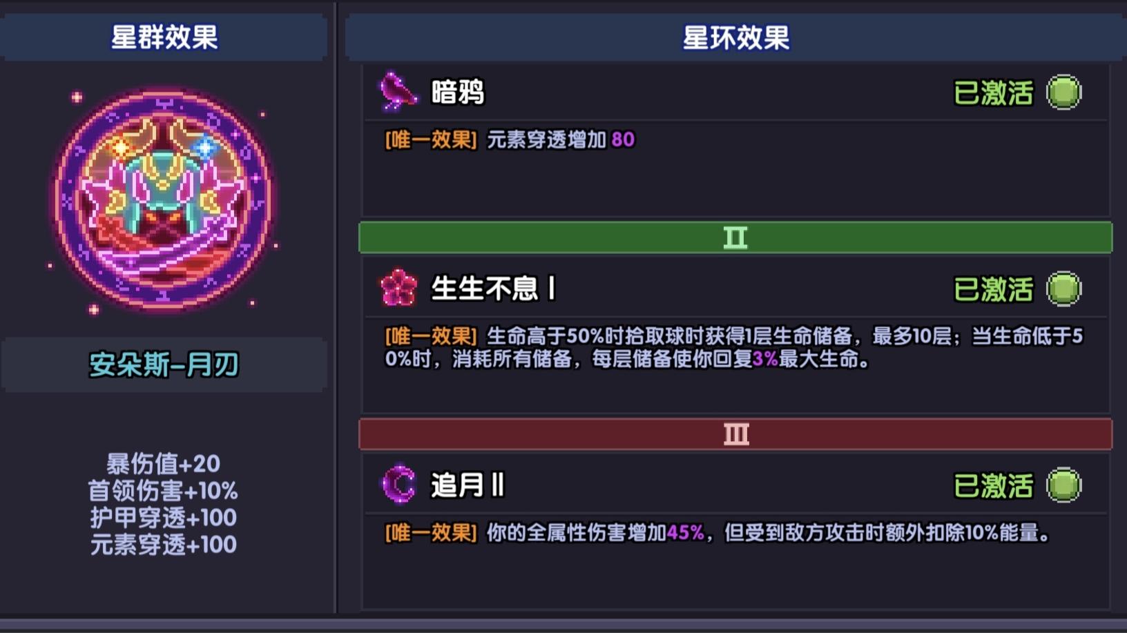 三环:追月:你的全属性伤害增加45%,但受到敌方攻击时额外扣除10%能量。