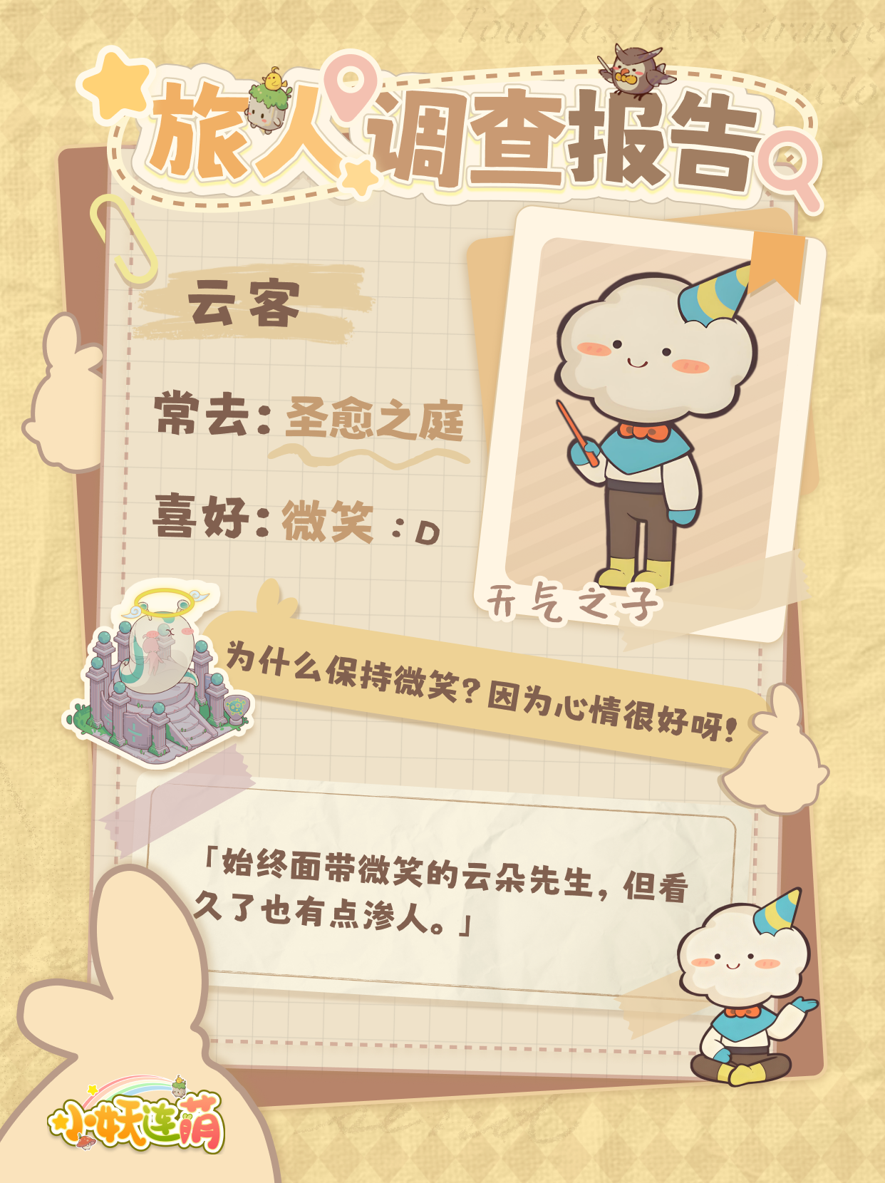 比如,肥鹰刺客通过旅行减肥,鲨鱼水手通过旅行练习潜水,再比如云客先生通过旅行,呃......获取微笑的神秘力量!