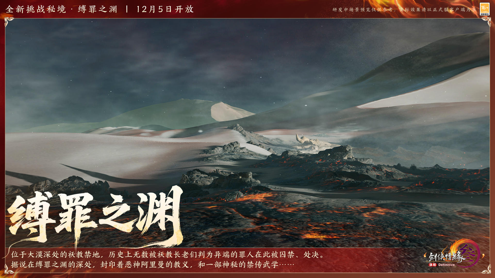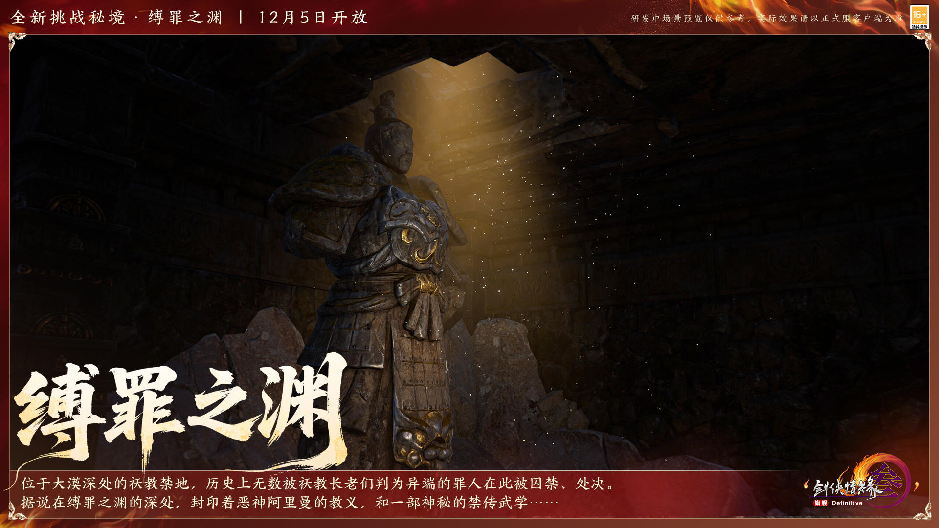 “缚罪之渊”位于大漠深处的祆教禁地中,无数被祆教长老判为异端的罪人在此被囚禁、处决。若能勘破层层险阻、抵达秘境最深处,更有禁忌隐秘静待揭晓——全新25人挑战秘境“缚罪之渊”一号首领将于12月5日20:00开放。