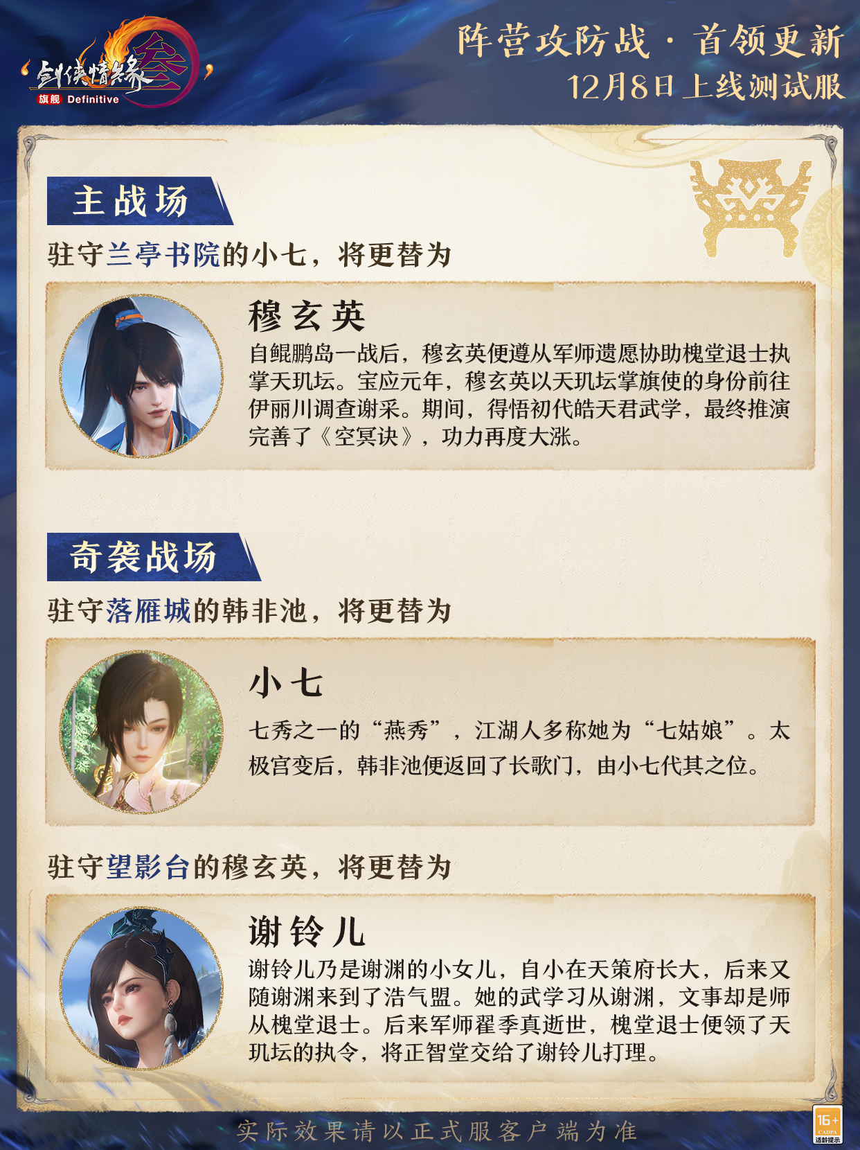 本次首领更新涉及的成就不会新增、减少或绝版,其对应资历点也不会变。已完成的首领对决成就将依据规则更新显示为新版成就,详情请见后续相关公告。这批阵营首领将跟随家园新赛季版本正式上线,其测试服会率先在12月8日16:00开启。本次测试无需提前申请资格,所有侠士均可直接前往参与体验!更多测试服精彩内容将于后续爆料,敬请期待!