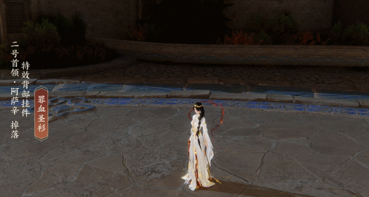 特效背部挂件“罪血圣衫”是被岁月侵蚀的染血布条,据说曾是封印恶神阿里曼的尸布,沾染了恶神的罪业之血,后被阿萨辛盗走。他以此布为衣衫包裹自身,表示将与阿里曼神一同承受所有的罪业与刑罚。他的信徒因此将身着红衣视作与神同在的圣行。