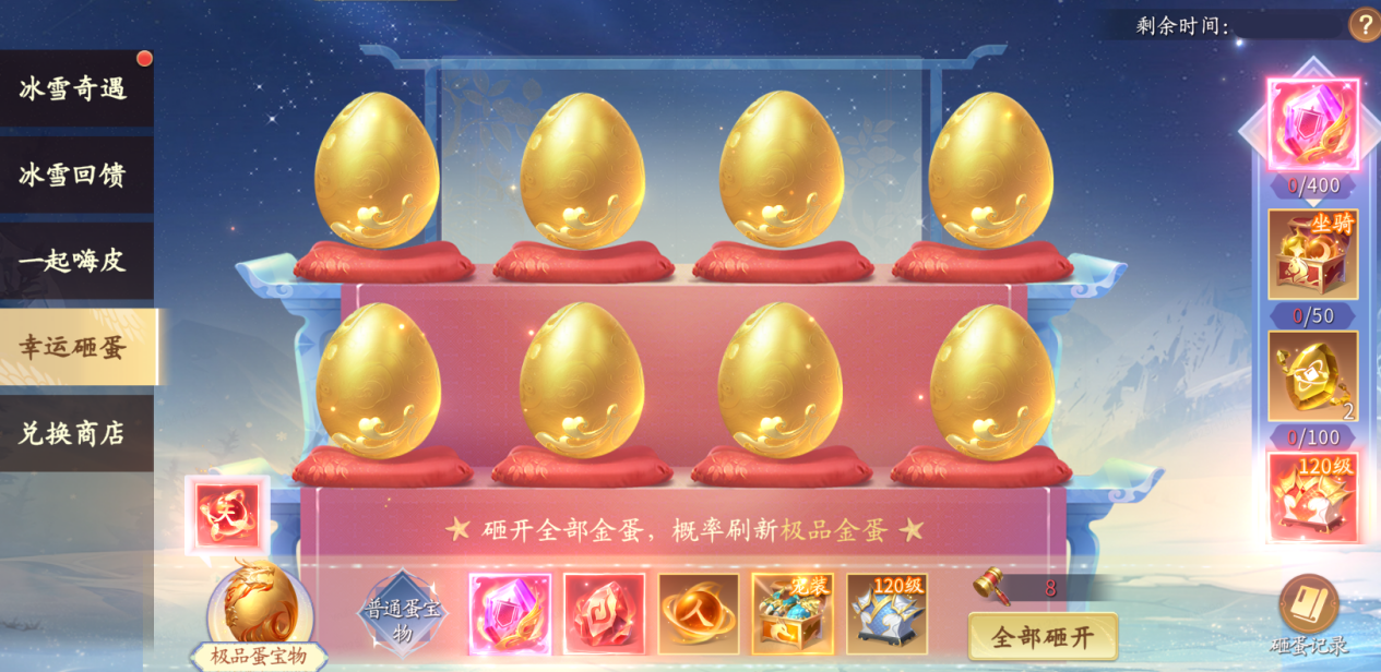 今年的最后一轮砸蛋即将开启!仙友们的好运气还在吗~12月5日5:00-12月8日5:00期间,前往【冰雪奇缘】活动,邀你执砸蛋小锤,叩启雪境秘藏~