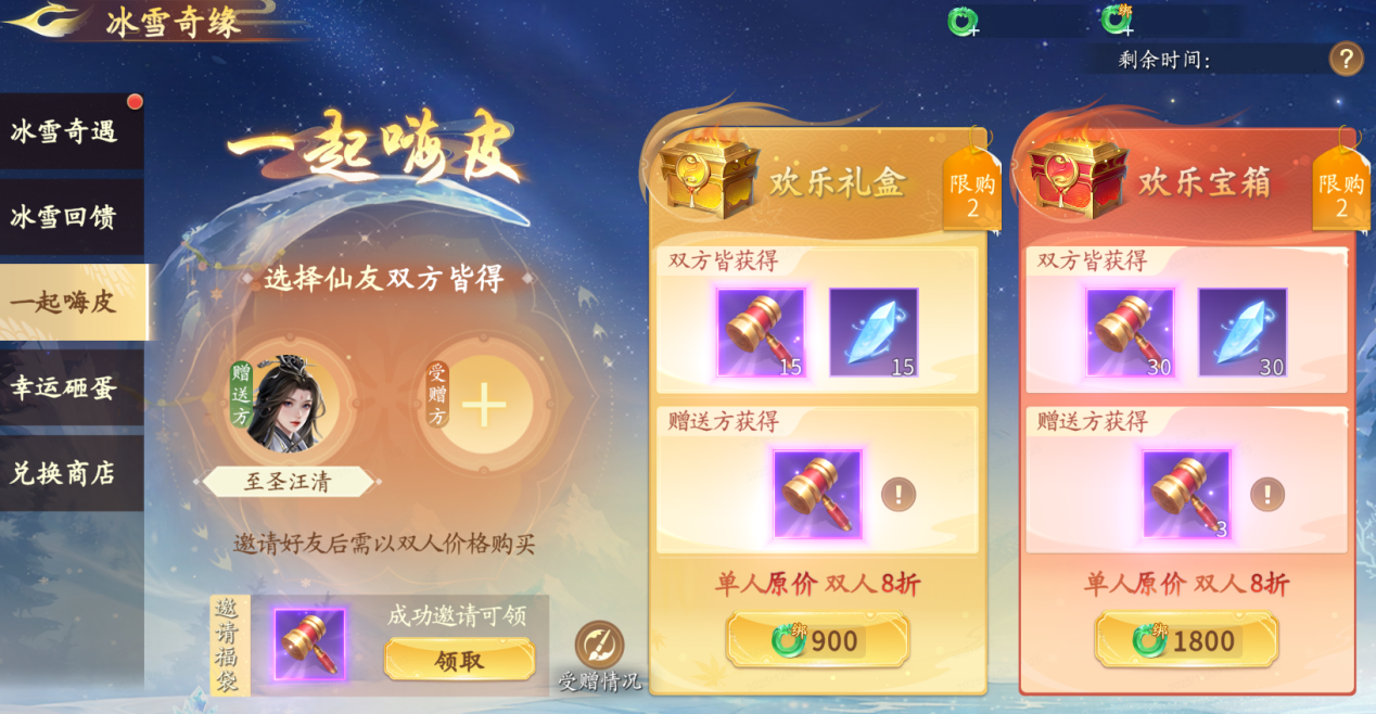 砸蛋前当然得准备好小锤啦!双人成行,一起嗨皮!可原价购买一人份小锤礼盒,也可邀请仙友享受双人8折优惠价,为自己和仙友各购买一份礼包!每种礼包都限购两次也仅可受赠两次,赠送方将额外获得邀请礼和赠送礼~邀请需对方同意,成功邀请后只能进行双人购买。