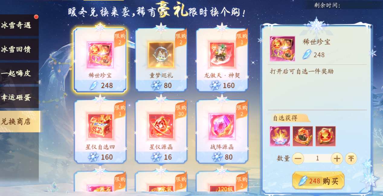 12月5日5:00-12月9日5:00期间,冰雪商店限时开启,稀有豪礼限时换个够!新坐骑和超多培养材料等你来享!