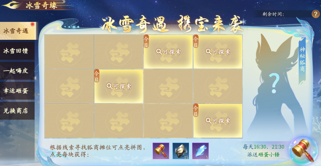漫天飞雪,奇遇不断,揭秘线索,探寻宝物!根据线索寻找狐商可点亮拼图获得奖励,每日指定时间还有限时宝箱出现在今日开启的神秘狐商附近,根据提示前往寻找,先到先得!