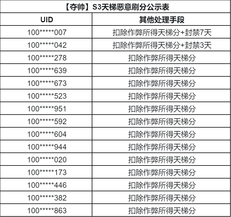 一、S3赛季刷分违规行为处罚公示