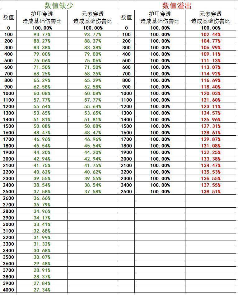 双穿溢出/缺失伤害倍率表