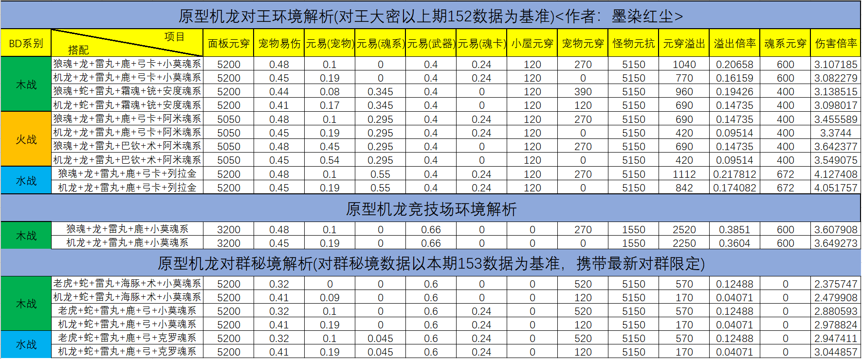 当前版本更新了153,但是因为木图153的怪物刷新非常分散且无法聚怪,所以木图依旧需要使用老虎,本表格只对水战以及木战进行分析,由图表可知,机龙相关配置的强度要高于老虎的相关配置。