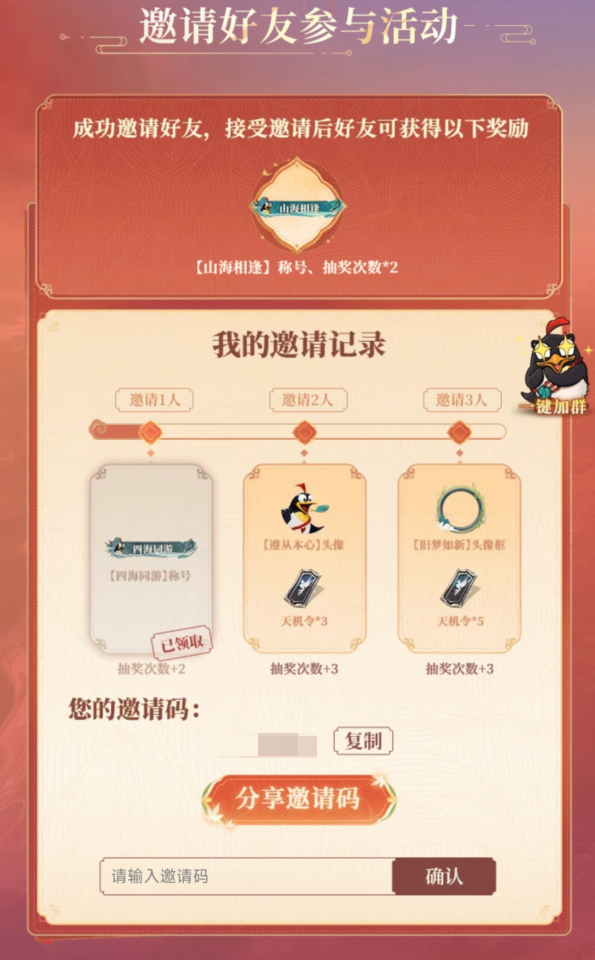 ◪少将军成功邀请1位好友,可获得【四海同游】称号、抽奖次数*2;成功邀请2位好友,可获得【遵从本心】头像、天机令*3、抽奖次数*3;成功邀请3位好友,可获得【旧梦如新】头像框、天机令*5、抽奖次数*3。