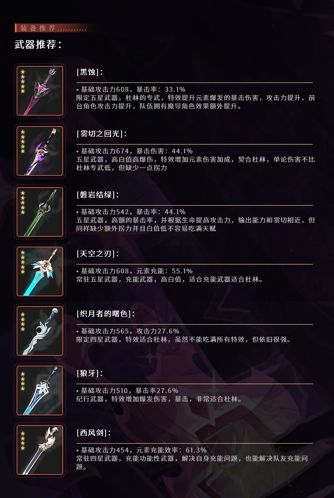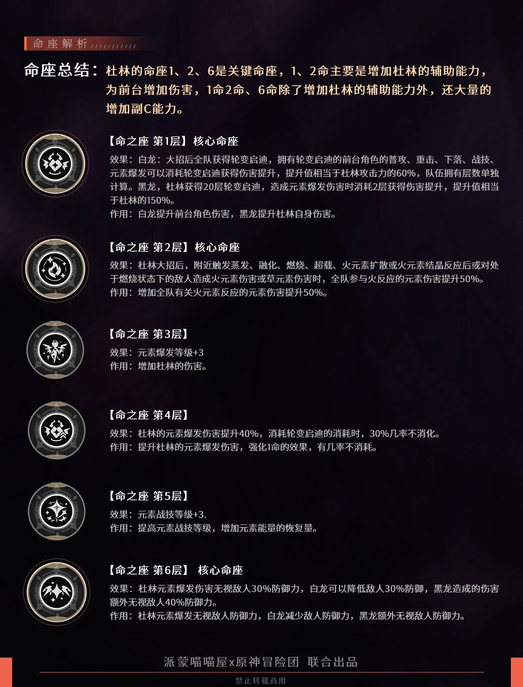 效果:白龙:对敌人触发除蒸发、融化之外的火元素反应时,该敌人的对应抗性降低20%;黑龙:杜林触发的蒸发、融化反应,造成的伤害提升40%。