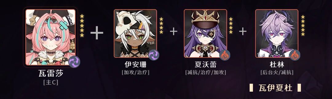伊安珊提供攻击力加成,并且有少量的治疗;夏沃蕾可以减少敌人的抗性,增加雷火的攻击力,为前台前台治疗,杜林的后台火正好可以触发超载,并且还能减少敌人抗性,是超载队理想的后台火
