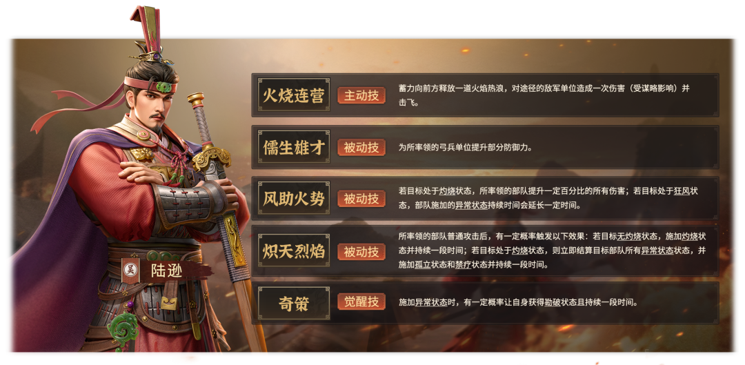 陆逊的技能设计围绕 “弓兵体系核心 + 异常控制大师” 展开,以 “火” 为核心元素,兼具控场、输出与团队增益,完美还原他 “以智谋破敌” 的作战风格。