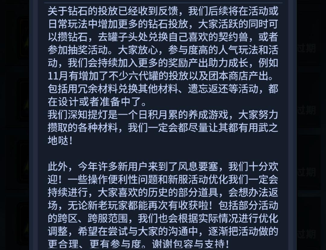 邮件公告重点就在如图所示内容,首先是钻石投放,刚开服那会,钻石获取还是相对现在充足的,后面砍元素塔奖励,砍每周钻石哥布林掉落等等,现在消耗钻石越来越多,但是获取率少之又少,连洗练的坩埚都需要钻石,各类东西增多,背包扩展等等,增加钻石获取率确实刻不容缓,比较还是普通玩家较多。宗旨还是普通玩家白嫖,氪佬早享受为主,是目前较为好的运营出路。然后就是11月投入大量六代宠物罐子类,确实投入很多,但有相当一部分是需要氪佬才能拿到的,这不叫大量投入,而是增加财政收益,但绝大多数微氪不想当冤种。还有团本,古神之翼给5代罐子,连个6代罐子都舍不得给,本源团本,新增了冰封套的变种首饰,给没有的小伙伴有代替品,还新增了四代光神个五代钻石宠物,限定条件是每周兑换一次,是不是觉得策划人很好,其实是把玩家智商按地上的,玩家纯小丑🤡🤡🤡,如下图,本源一周只有50材料,一个月4次也就200材料,神话箱子300材料,四代光神200材料,五代钻石宠150材料,合计650材料,也就是要每个都换得三个月材料。我这都没算其他要兑换的。
