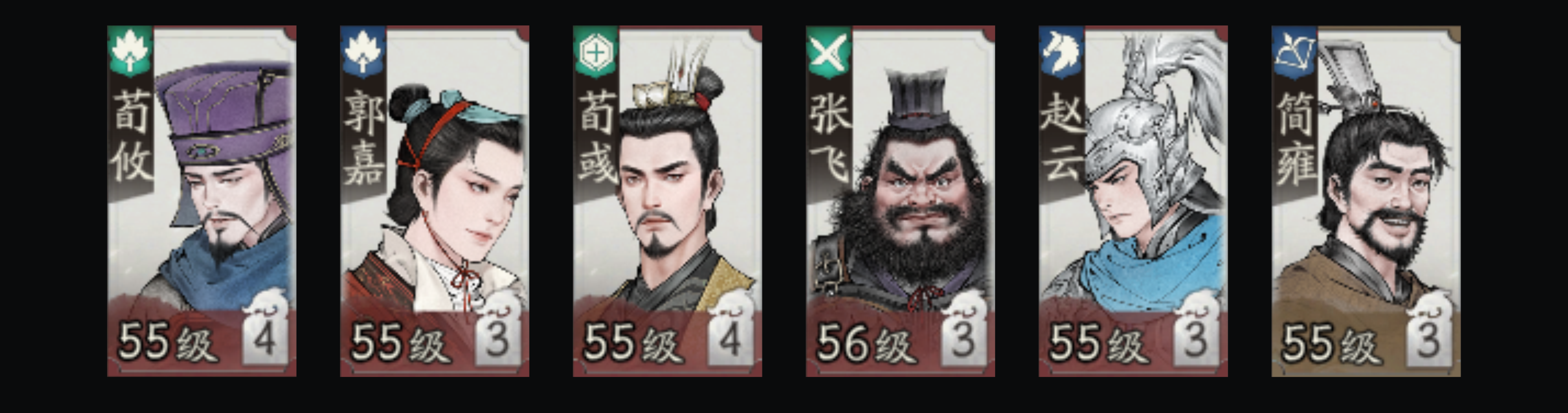 荀攸、郭嘉、荀彧、张飞、赵云、简雍