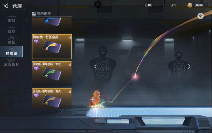 抛物线-七色宝葫,投掷物落点处是个色彩鲜亮的七色宝葫造型,抛物线则是一道彩虹色的光带,光带还带着渐变的光泽感,看起来灵动又华丽。