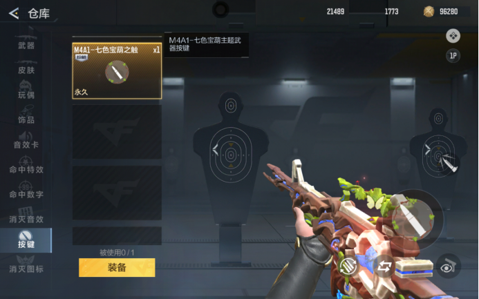 M4A1-七色宝葫-葫芦之印并不是一味的复制葫芦造型,而是将射击按键的一圈缠绕着三段深棕色藤蔓纹理,藤蔓节点处点缀着绿色葫芦叶,精致感十足。