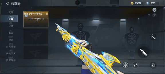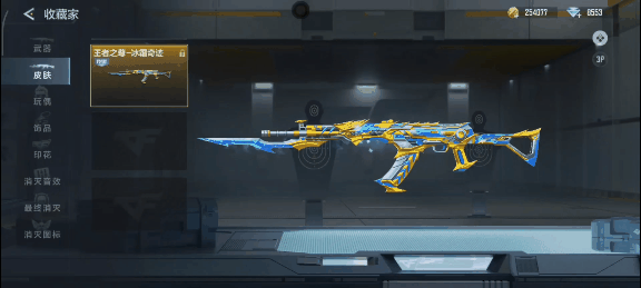 王者之尊-冰霜奇迹继续延续了冰霜奇迹系列皮肤的特点,将王者之尊原有金色主调转为蓝金撞色,营造出冰天雪地中的王者气场,枪身覆盖晶莹剔透的冰霜纹理,仿佛极地冷雾凝结在金属上,金属表面呈现蓝银色光泽,在光线变幻下闪烁冷冽光芒,枪身周围漂浮着细小雪花,增添动态美感。