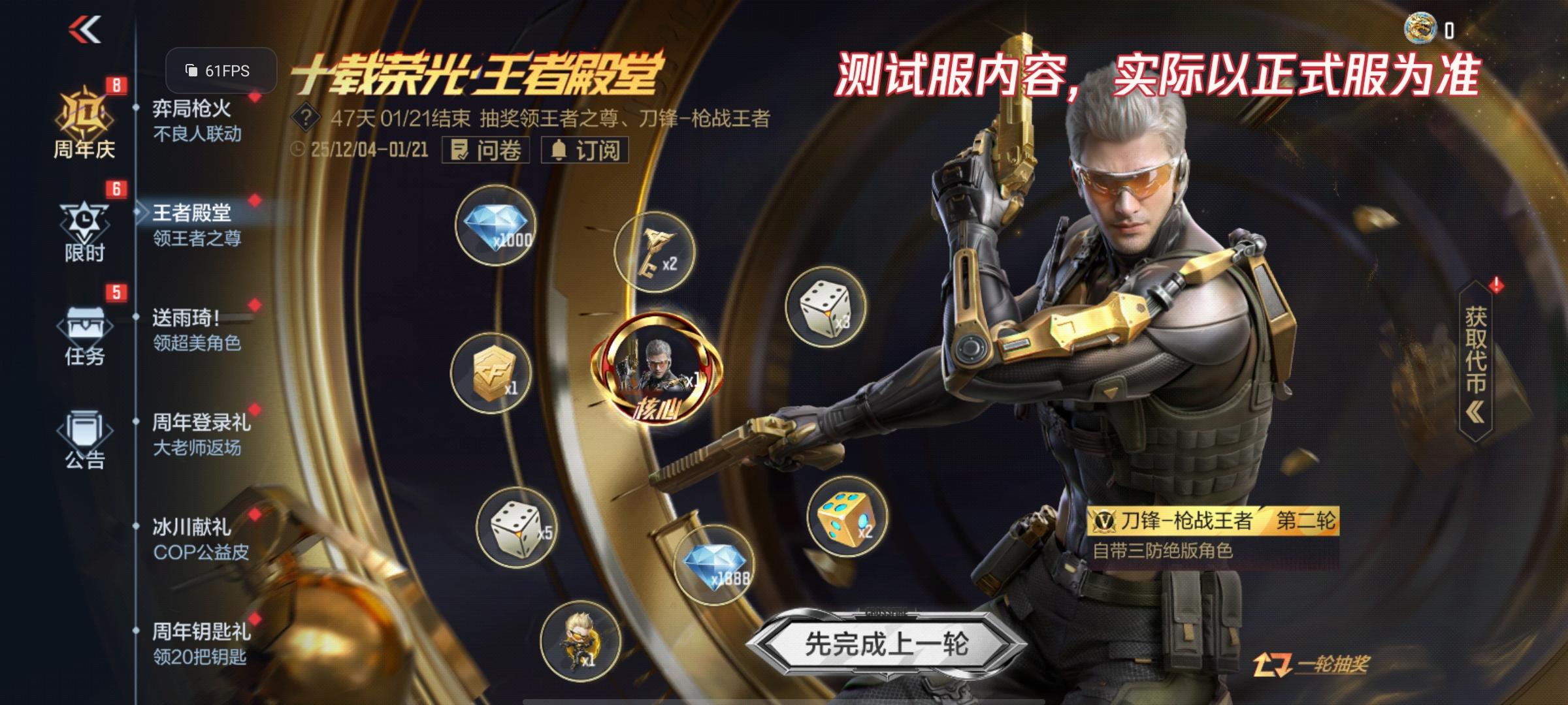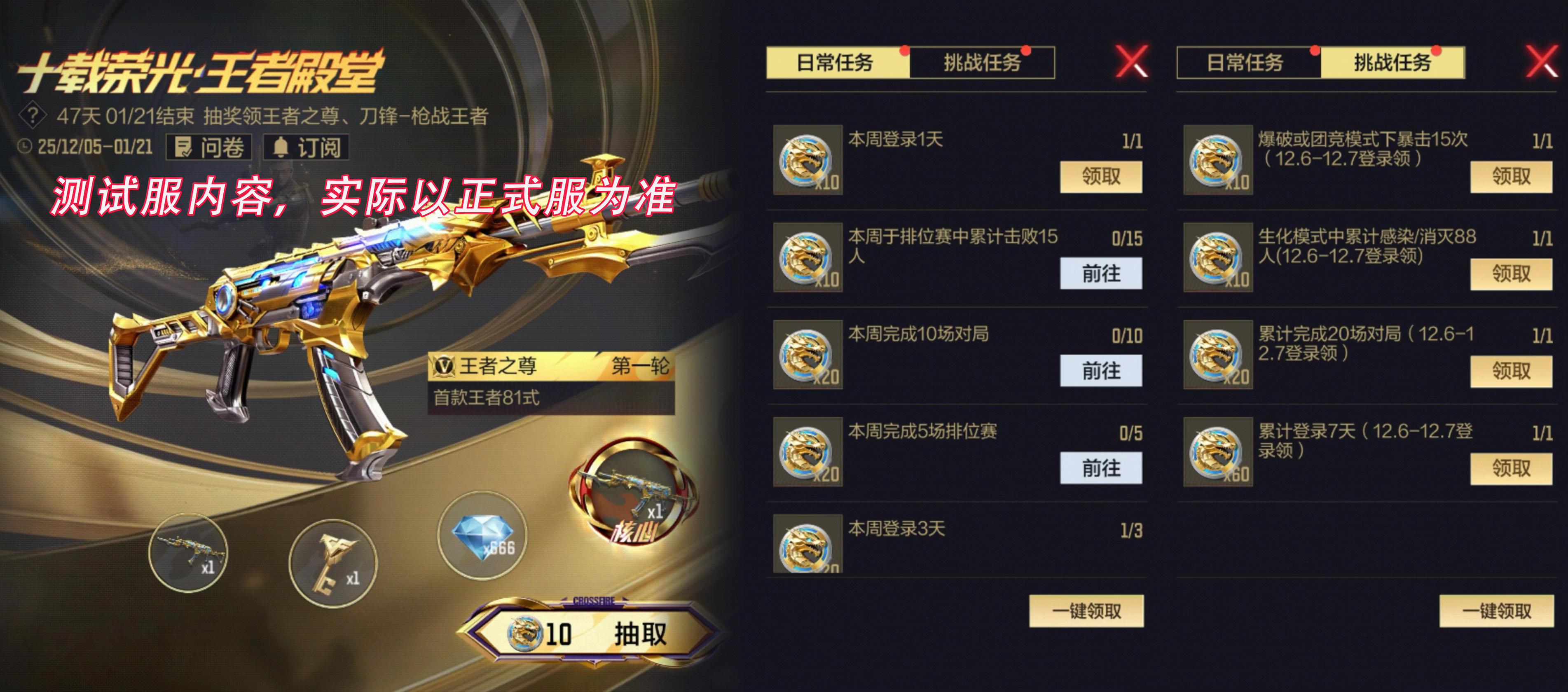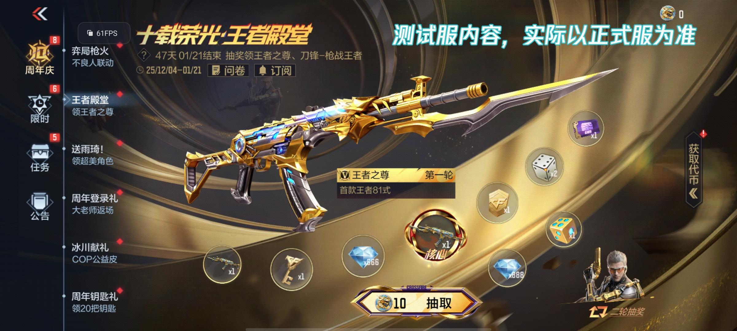 《十载荣光·王者殿堂》活动将于2025年12月6日正式上线,各位CFer可通过此活动免费获取全新王者级81式步枪“王者之尊”、十周年专属限定三防角色“刀锋-枪战王者”、十周年专属背饰“刀锋-枪战王者玩偶背包”、英雄之钥、典藏之骰等众多大奖。