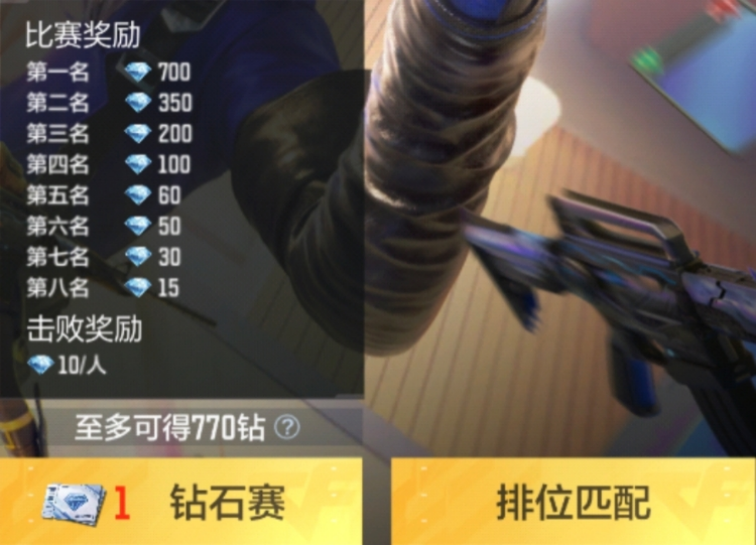 花费200钻石购买一张钻石赛入场券才可进行对局,每场对局消耗一张钻石赛入场券。进入游戏后,玩法与排位匹配完全一致,对局结束时,系统会根据你的名次发放相对应的比赛奖励,同时钻石赛还具有击败奖励,每击败一人可获得10钻石。对局后的实际钻石奖励由排名奖励和淘汰奖励合并所得。