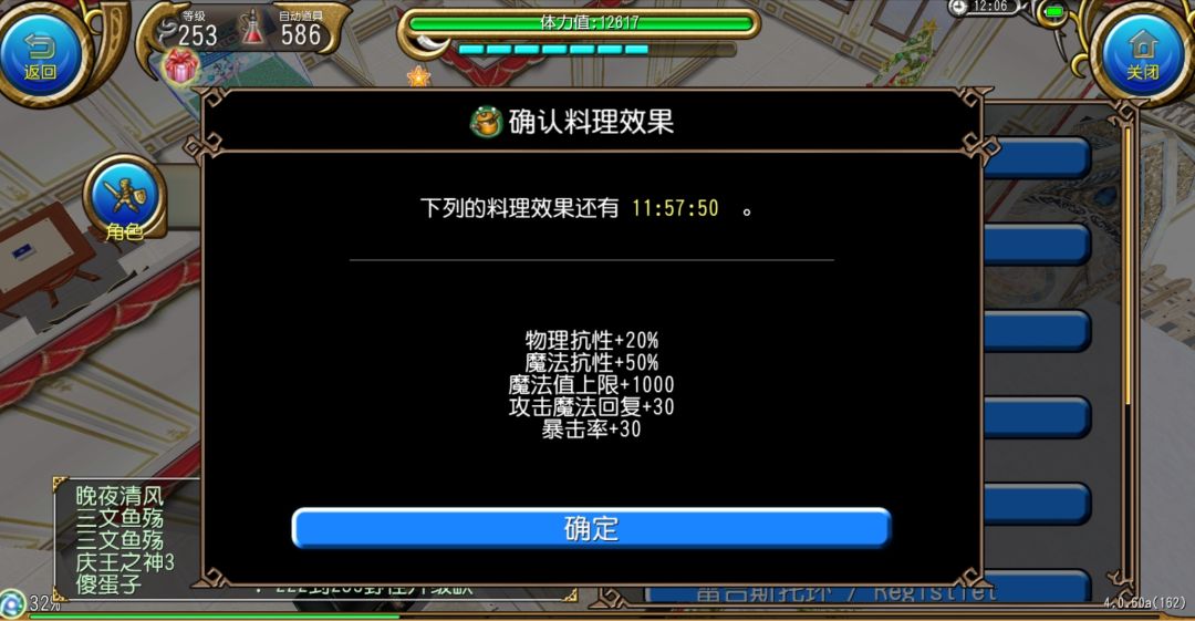 魔抗料理、魔法值上限料理、攻回料理、暴击料理。