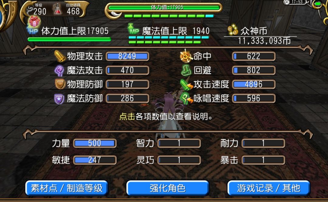 暴击141,贯穿(时装15)76,物抗(五级料理)0,魔抗50,血量1.7w,面板9000+。