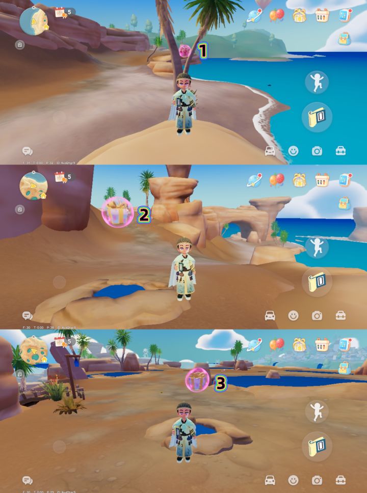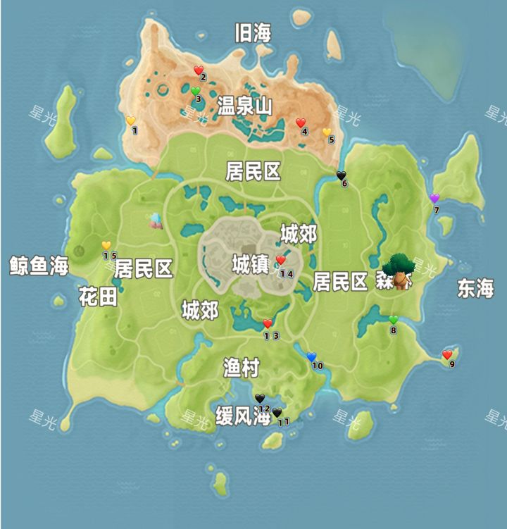 粉红泡泡位置分布:图一地图的15处爱心标记,分别在温泉山6处(②号泡泡在温泉山遗迹后面路口旁温泉洞眼;③号泡泡在温泉山湖周围的温泉洞眼)、森林4处、渔村2处、花田1处、城镇2处。 粉红泡泡里有随机送拼图盒子、家具、满愿星和材料!