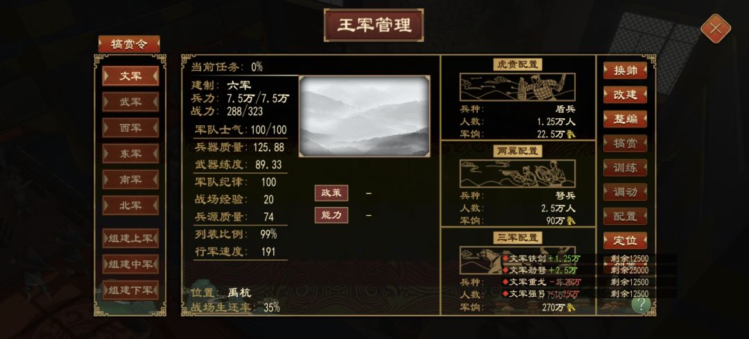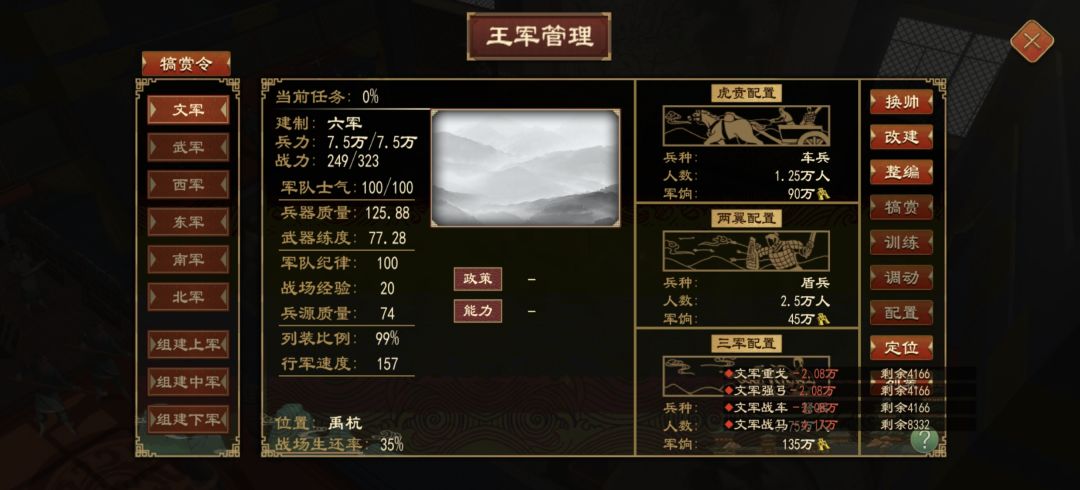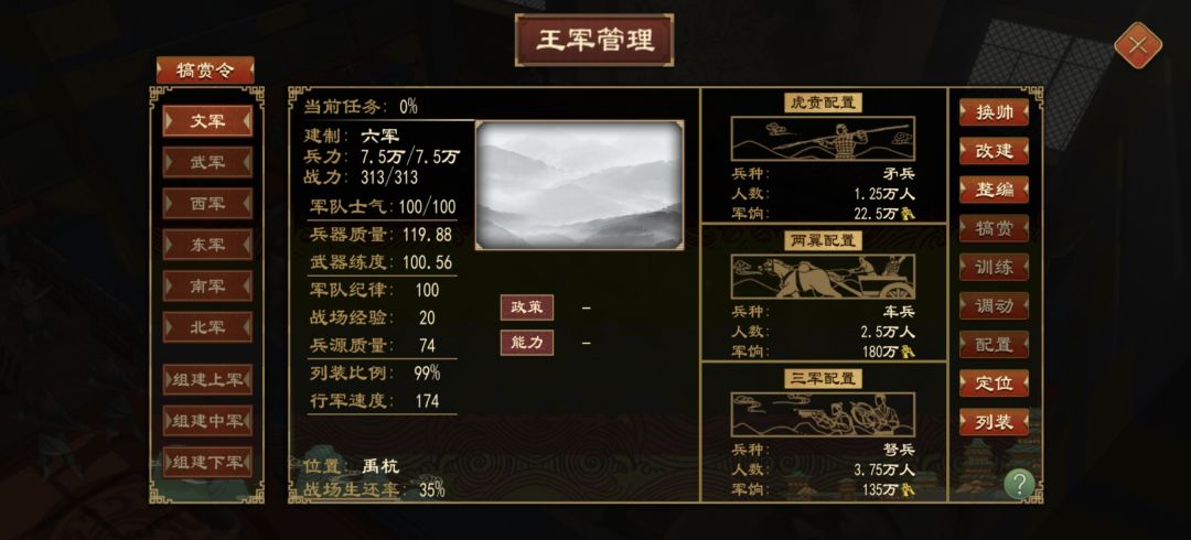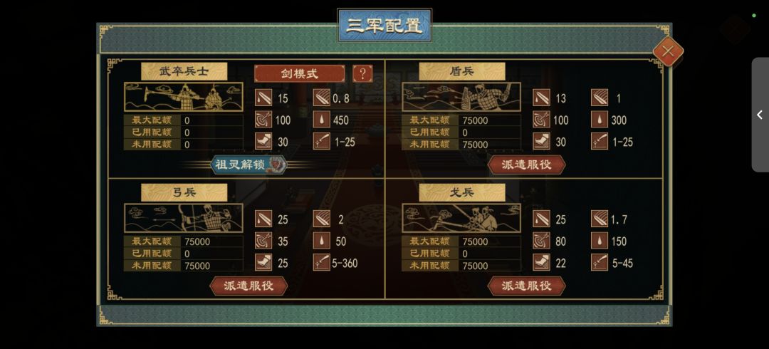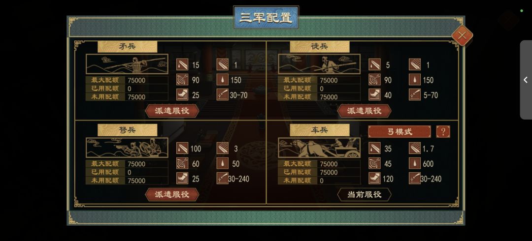 车兵是三个人一辆车,一个单位要占三个人,满编相当于25000驾车,25000射箭,25000持戈近战