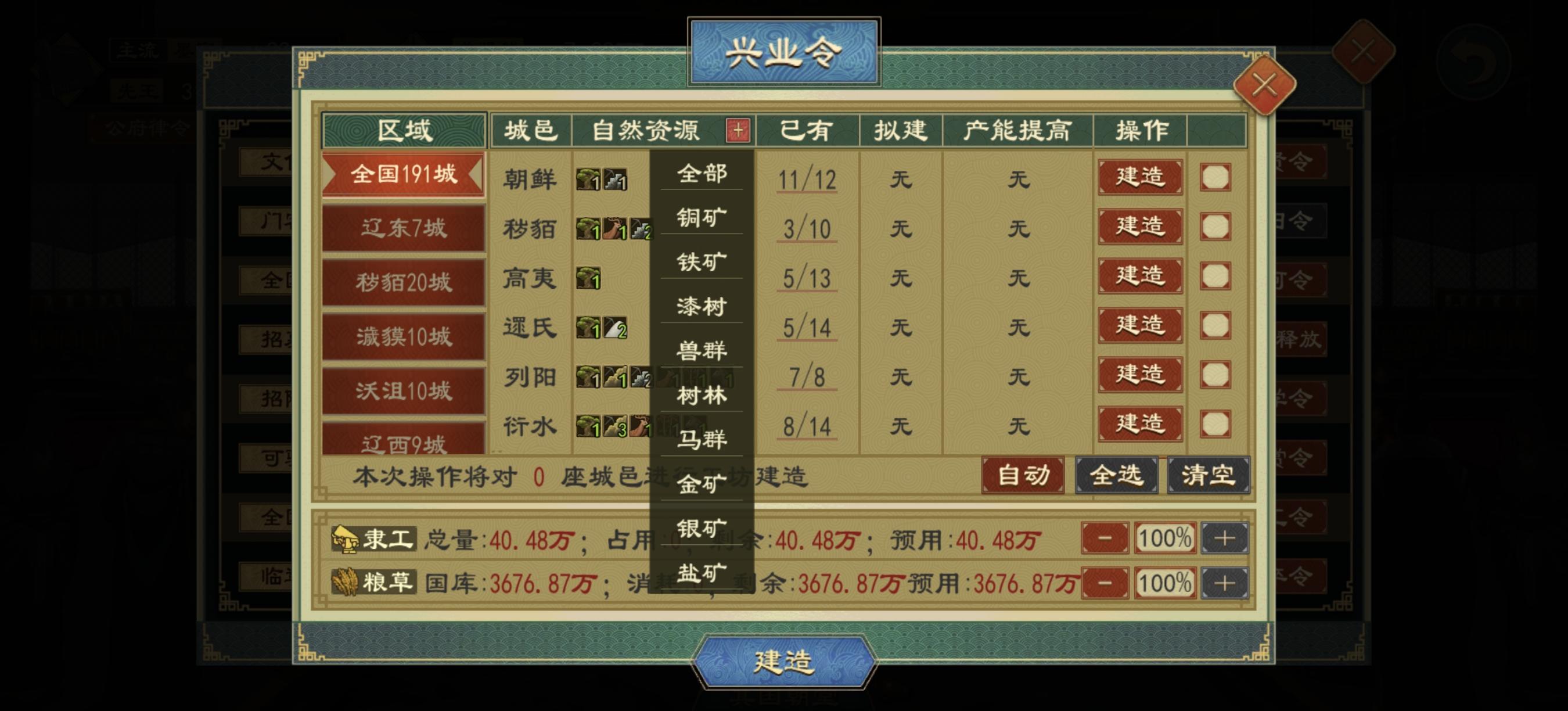 首先点击,自动,然后清空,把学校,监狱,军舍,农田,这几种忽略,剩下的手动全都点满,最后,点击下面的建造就可以了。(这个操作把所有的原料都给他开工,直接开采,包括前面讲的优先的茶树,金银矿都涵盖在这个操作里)如果不知道这个城市建了哪些建筑,怎么看呢?如上图所示点击上图中导览栏里的“已有”,具体到每一个城市比如朝鲜11/12,可以点击这个就能够看到已经建了什么工厂了。