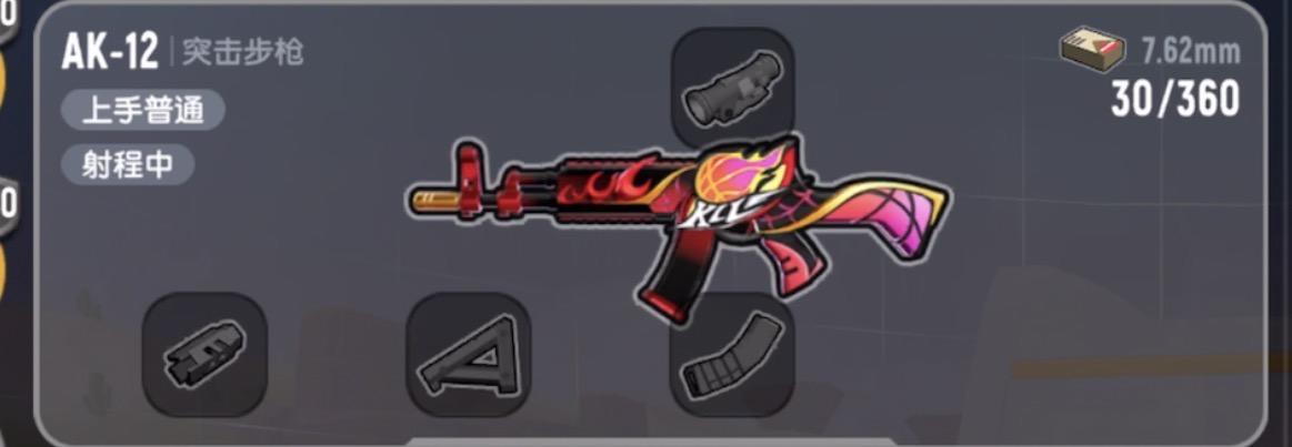将六倍镜设置为三倍,平地上或天降时,因其子弹速度并没有比 M4 快,且后坐力比较大,可以稍给一些提前量增加容错,反天降时,瞄准人物下方半个至一个身位即可!AK-12 的前几发子弹稳定性较高,所以要把握住前几发子弹的机会击败敌人!