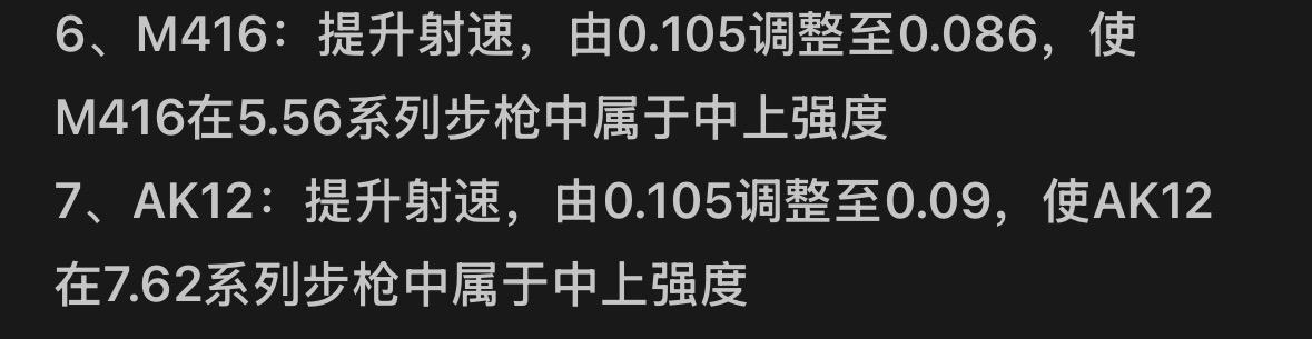 AK-12 作为 S4 新上线的武器,一直平平无奇,伤害没 AKM 高,射速没其他步枪快,后座力也较大,这次版本更新对其进行了加强,射速同样从 0.105 提升至了 0.086,但它的打击手感并没有 M416 那么好,后坐力较 M416 略大,伤害比 M416 高一些!