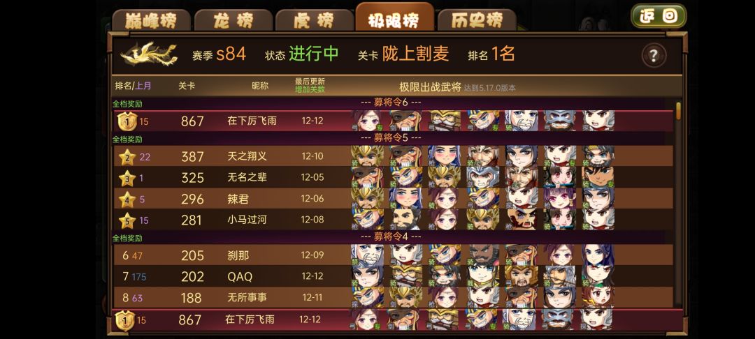 极限是新人积攒资源的重要玩法(全档募将令),排名越高,奖励越多!这里相对公平的可以和老登竞争,尤其是割麦!众所周知这是个策略游戏,一个人天下无敌的概率基本没有(需要阵容配合才能打出高伤害,高层数,高关卡,某些残暴的老登无视)