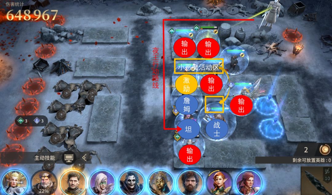 刷满奖励的基本思路就是把输出英雄放在夜王路线的中段,尽量覆盖更多路线格子。输出位放人可以比较随意,根据自己英雄的攻击范围在五个红圈里自由摆放即可。