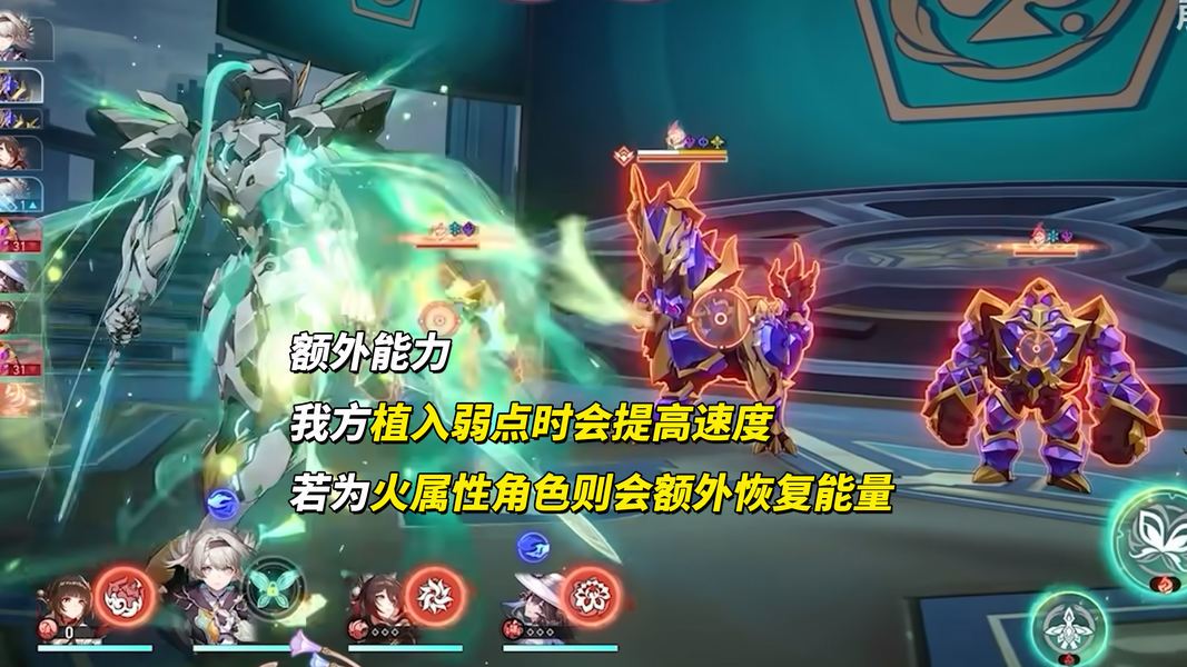 行迹额外能力之一,我方单位添加弱点时提升速度,若是火属性角色添加弱点则会额外恢复能量。