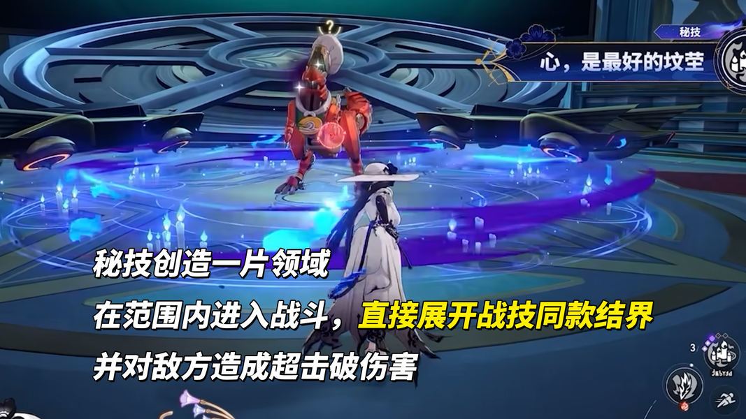 领域型秘技,在此范围内进入战斗,会展开战技同款【结界】,并造成1次超击破伤害。