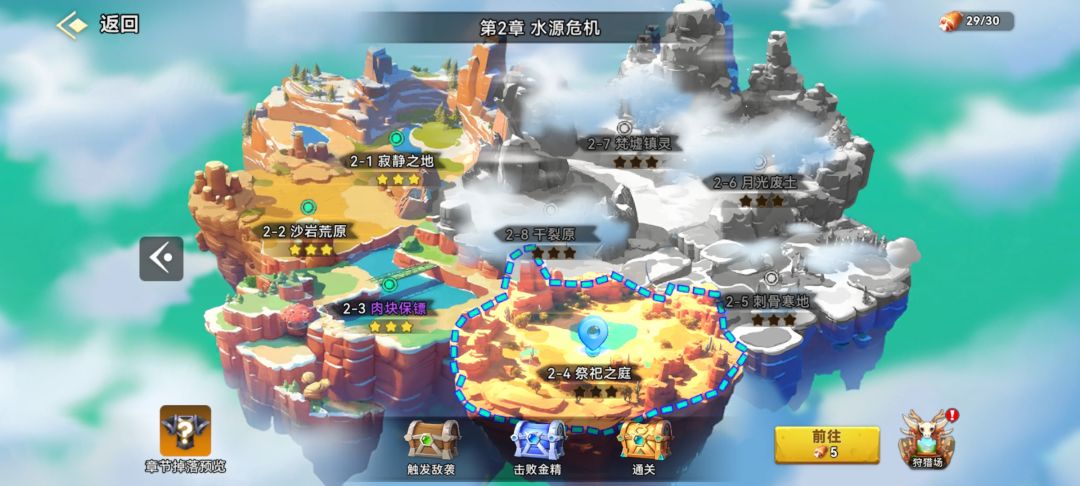「冒险」:核心推关入口,每章含5-8个小关卡,每通关解锁一章+狩猎场收益提升