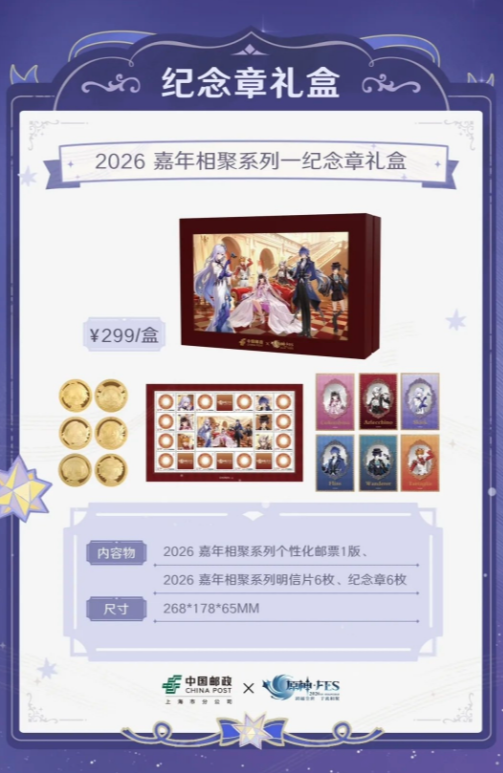 此次首发的周边以 “嘉年相聚” 为核心主题,涵盖六位原神角色的定制元素,推出两大限定礼盒。其中纪念章礼盒售价299元,内含2026嘉年相聚系列个性化邮票1版、主题明信片6枚及角色纪念章6枚,全套配置极具收藏价值;火漆印礼盒定价89元,包含同系列邮票1枚、明信片1枚与定制火漆印1个,满足玩家日常纪念需求。