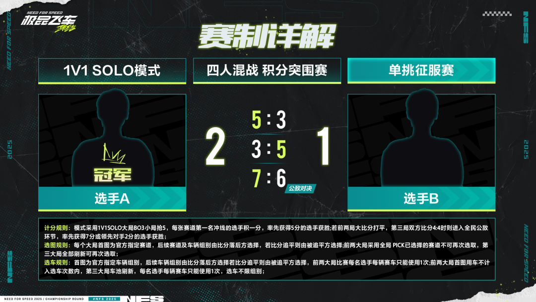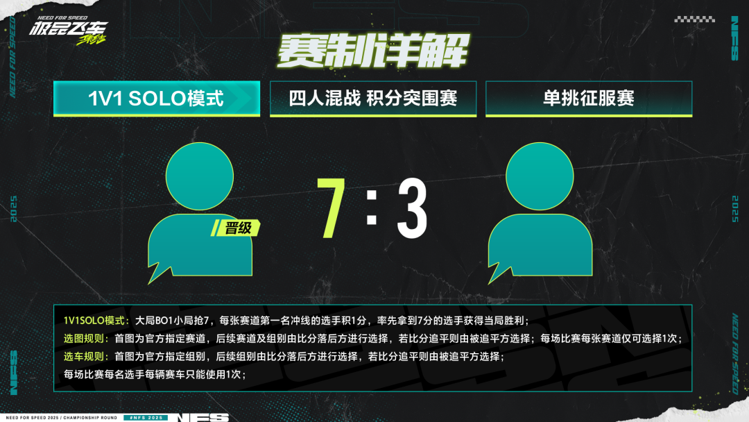 1V1 SOLO模式采取大局BO1小局抢7的赛制,率先赢下7分的选手为最终胜者。