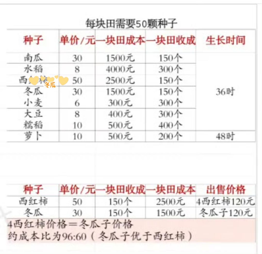 - 成本:30元冬瓜种子,生成3个冬瓜,1冬瓜 = 10元
