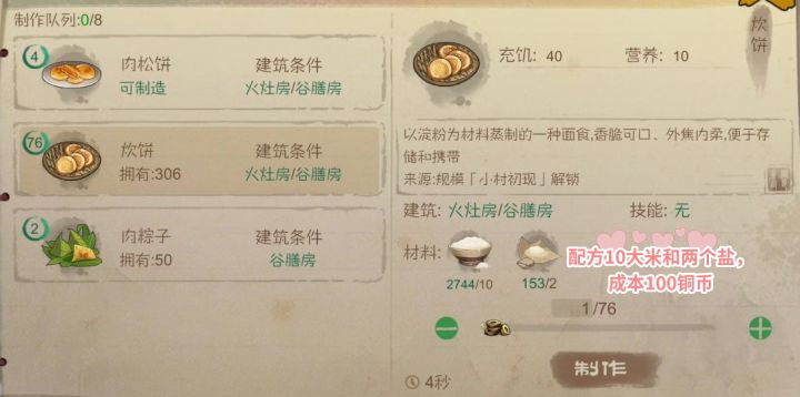 - 耗粮:20炊饼40时,40盐