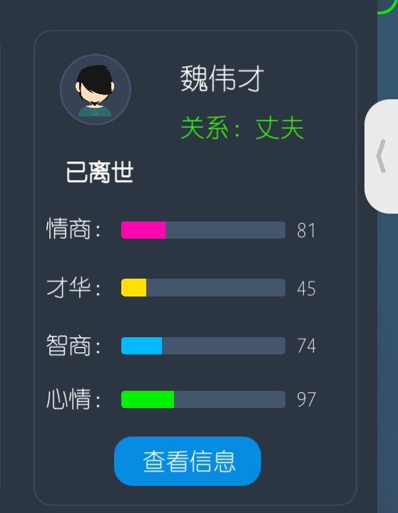 ②伴侣死了还人鬼情未了:二代角色继承的时候已经有对象了,想省离婚那60体,专门忍辱负重攒钱十几年学了隐形术,把人杀了却没法自动离婚,明明显示已离世却还是会在跟别人表白的时候出来扣好感度。点进角色页面也没有互动键,离不了婚。