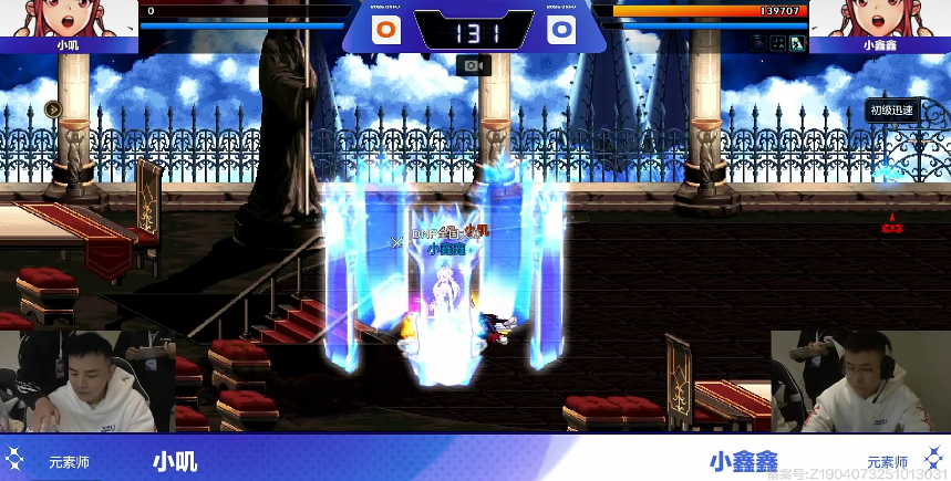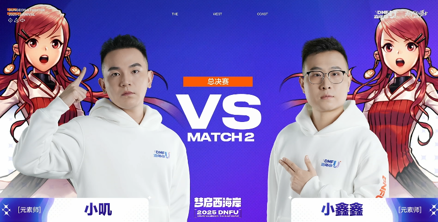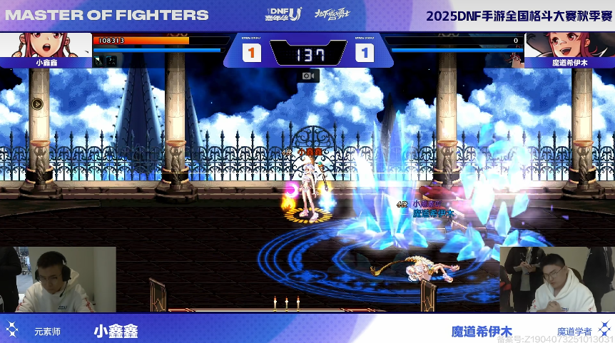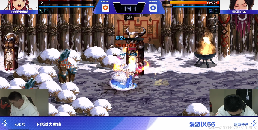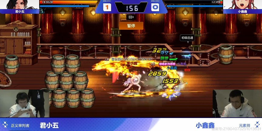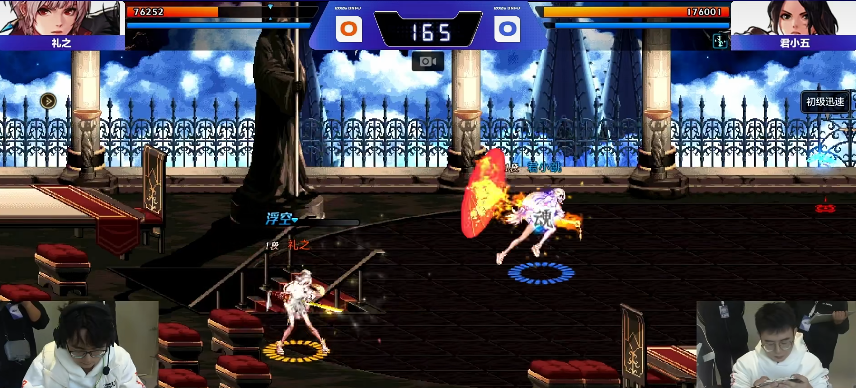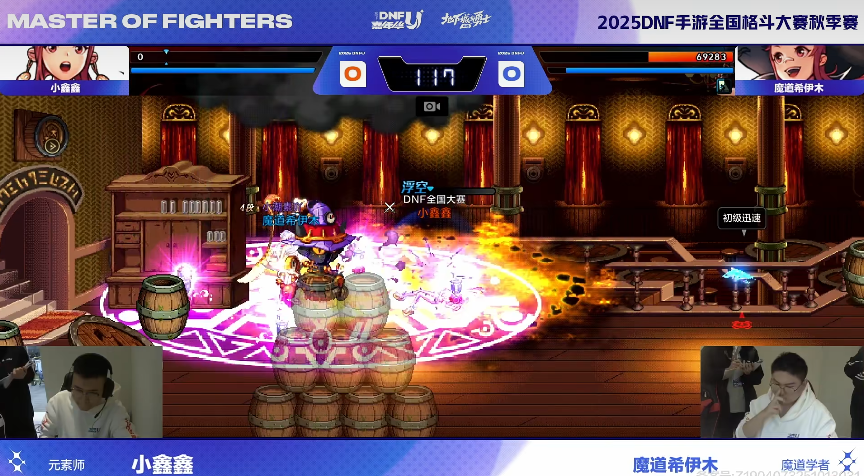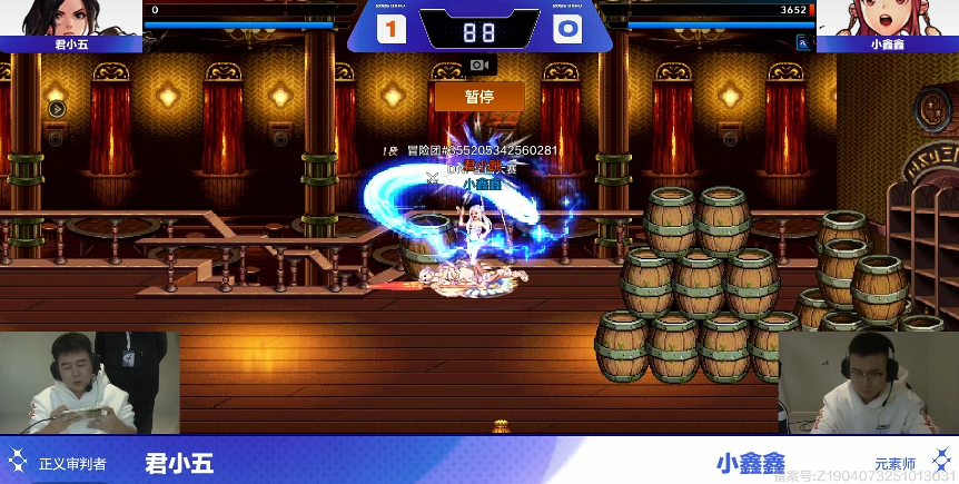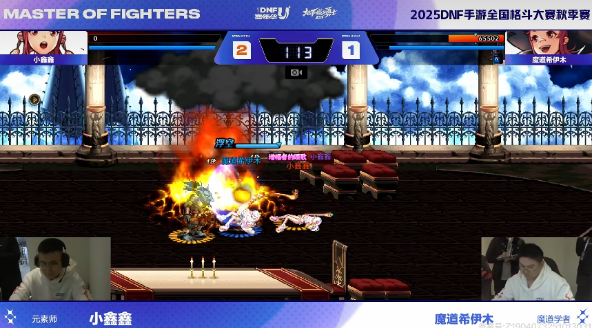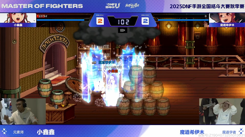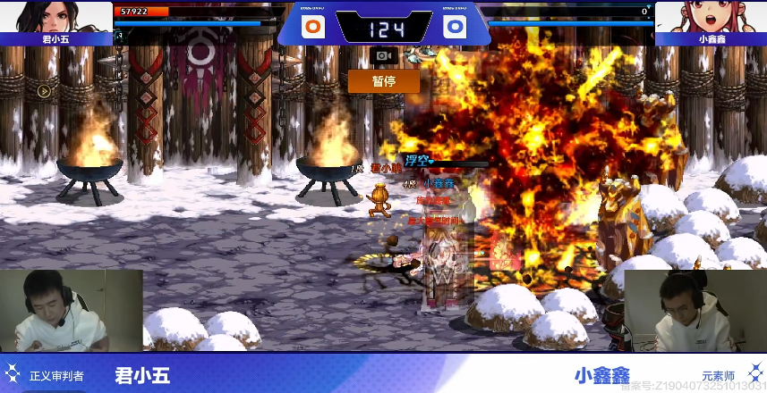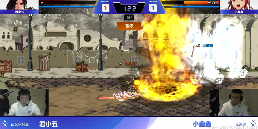 两人对战进入胶着,上方互相试探,这局比赛两人都没有打出过一整套的连招,全部依靠消耗,在消耗方面小鑫鑫的元素更胜一筹,追平比分