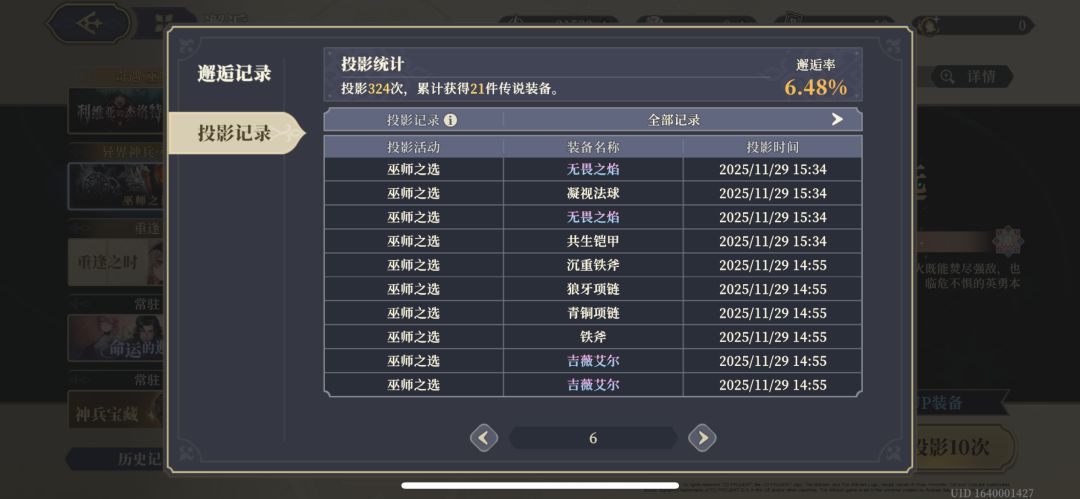 但本人在选择“无畏火焰”作为自选up抽卡的情况下,连续两次歪到了非自选的“猎魔人之剑”,与卡池规则描述不一致(如图2 3,注意卡池记录的页数顺序不是中间穿插了一把自选up)。