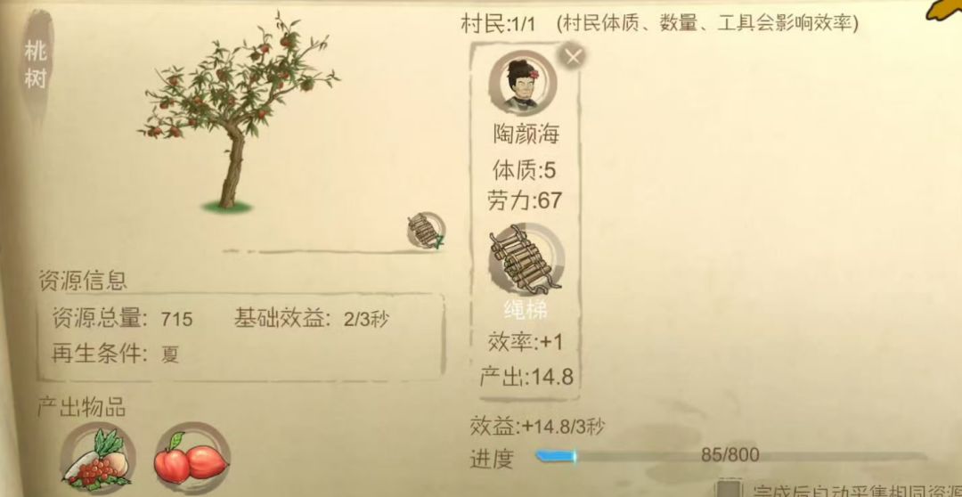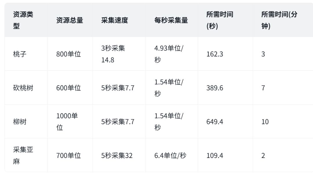 - 桃树资源日(约10分钟采桃+砍树): 集中力量先采摘桃子(约3分钟),再砍伐桃树(约7分钟)。两项任务合计约10分钟,恰好能在一个游戏日内高效完成。